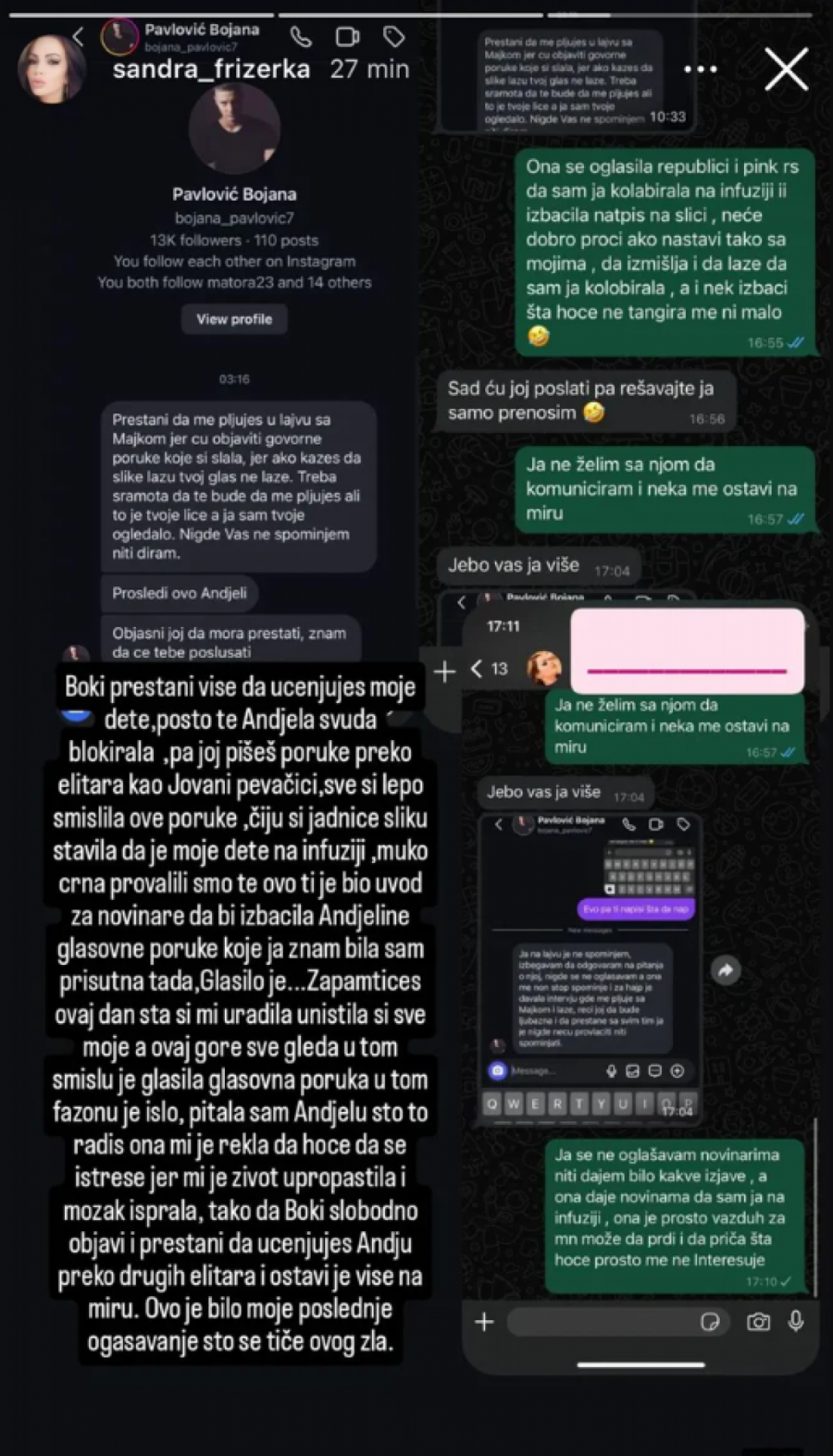 - Pitala sam Anđelu što to radiš, ona mi je rekla: "Hoće da se istrese jer mi je život upropastila i mozak isprala", tako da, Boki, slobodno objavi i prestani da ucenjuješ Anđu preko drugih elitara i ostavi je više na miru. Ovo je bilo moje poslednje oglašavanje što se tiče ovog zla - napisala je njena majka, a iza toga stajali su delovi prepiski.