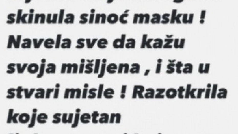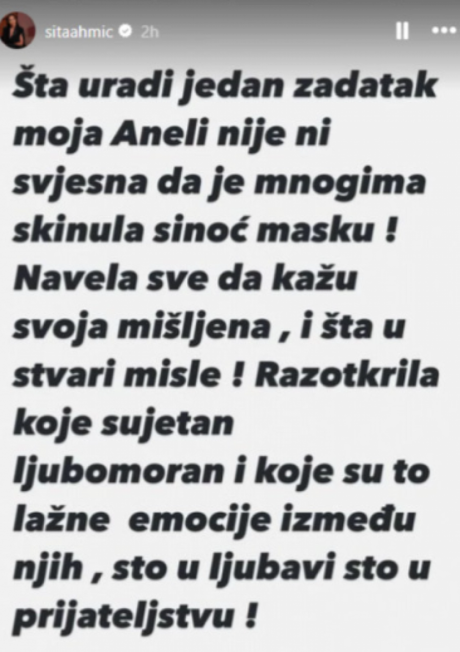 - Šta uradi jedan zadatak, moja Aneli nije ni svesna da je mnogima skinula sinoć masku! Navela sve da kažu svoja mišljenja i šta ustvari misle! Razotkrila ko je sujetan, ljubomoran i koje su to lažne emocije između njih, što u ljubavi, što u prijateljstvu! - poručila je Ahmićeva.