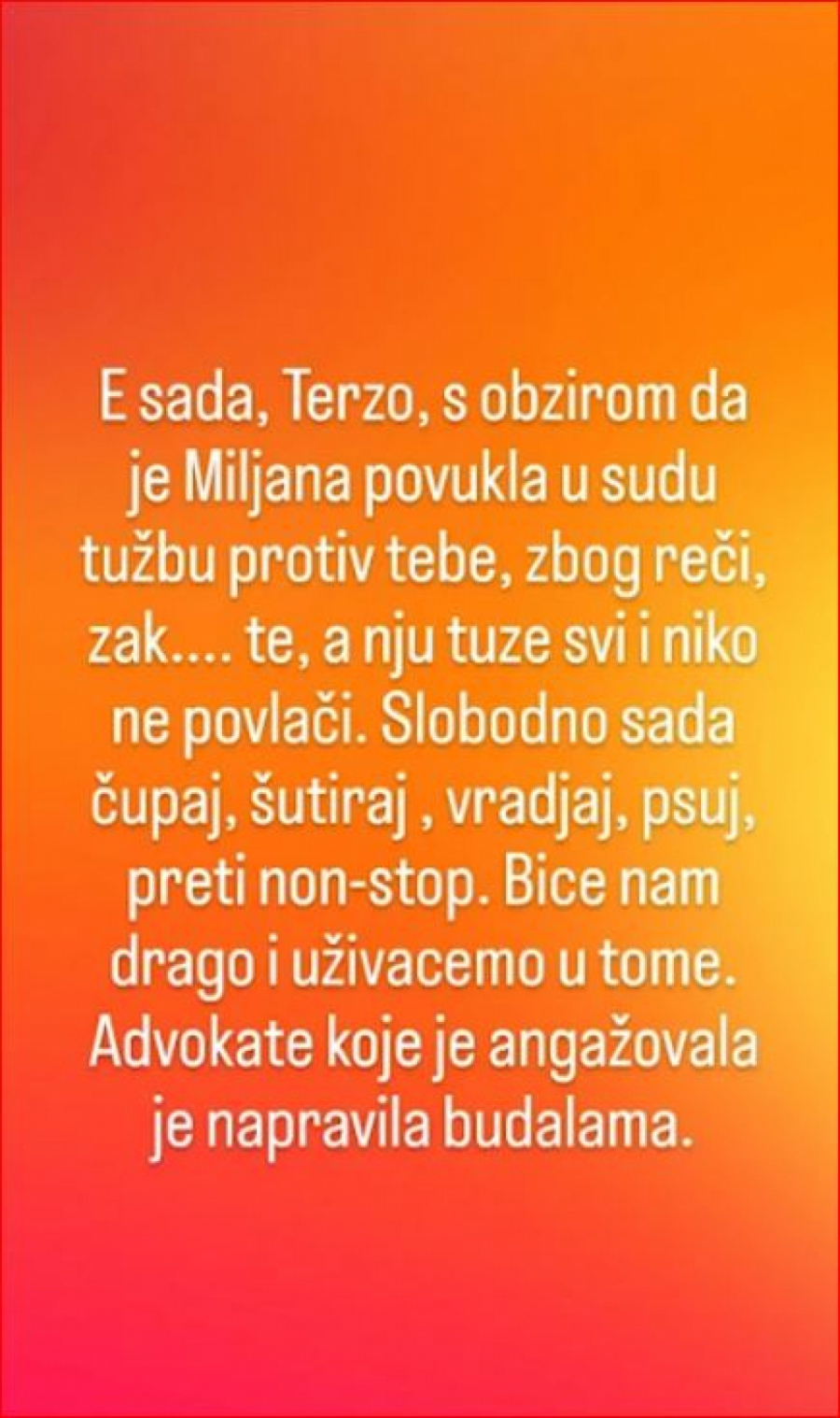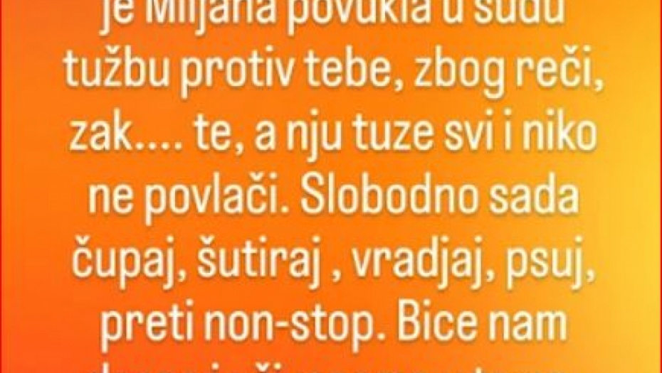 - E sada, Terza, s obzirom na to da je Miljana povukla tužbu na sudu protiv tebe, zbog reči z****u te, a nju tuže svi i niko ne povlači, ti slobodno sada čupaj, šutiraj, vređaj, psuj, preti non-stop. Biće nam drago i uživaćemo u tome. Advokate koje je angažovala je napravila budalama - napisala je Marija na svom Instagram profilu.