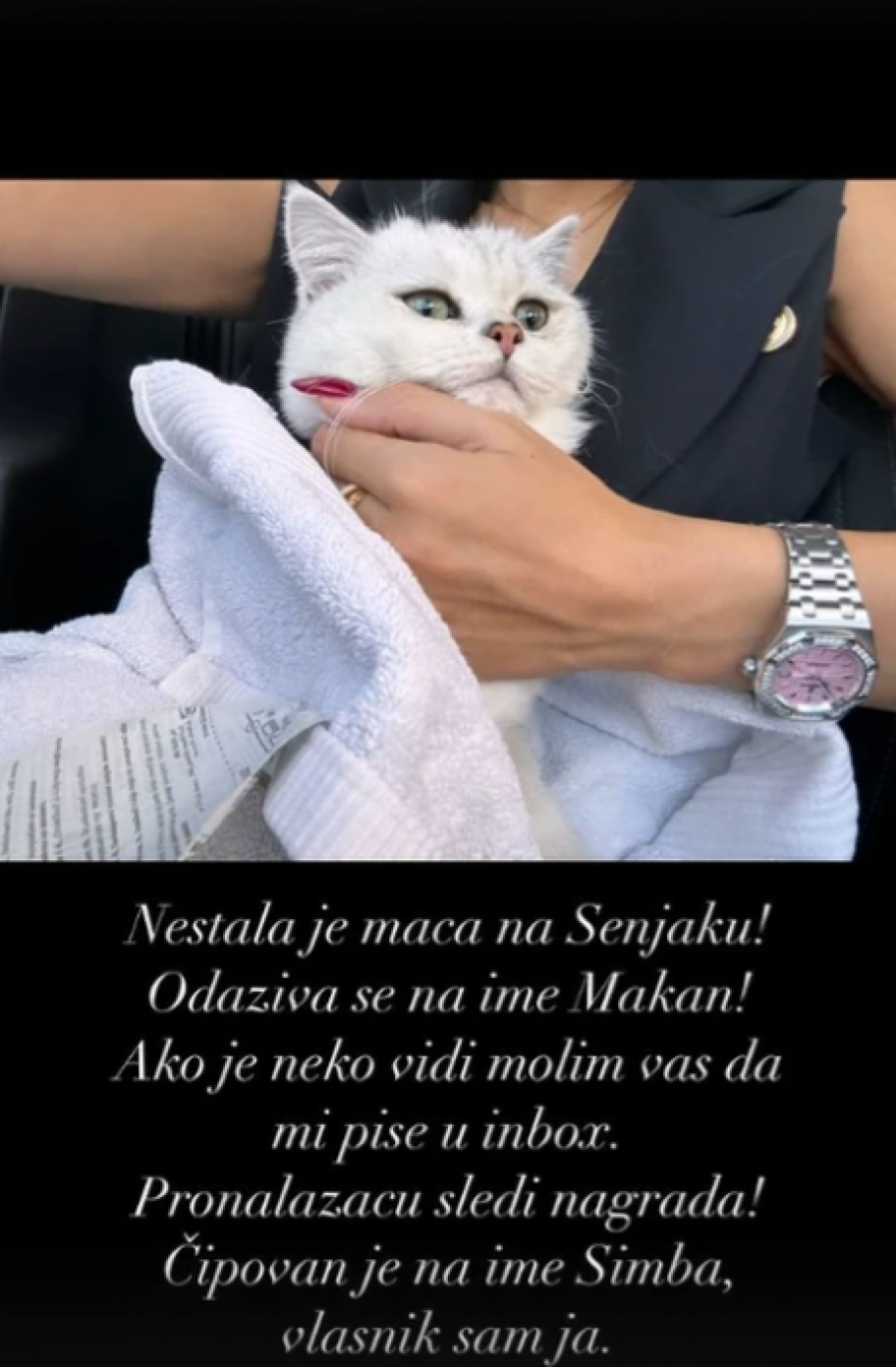- Nestala je maca na Senjaku! Odaziva se na ime Makan! Ako je neko vidi molim vas da mi piše u inboks. Pronalazaču sledi nagrada! Čipovan je na ime Simba, vlasnik sam ja - napisala je Ana, pa dodala: