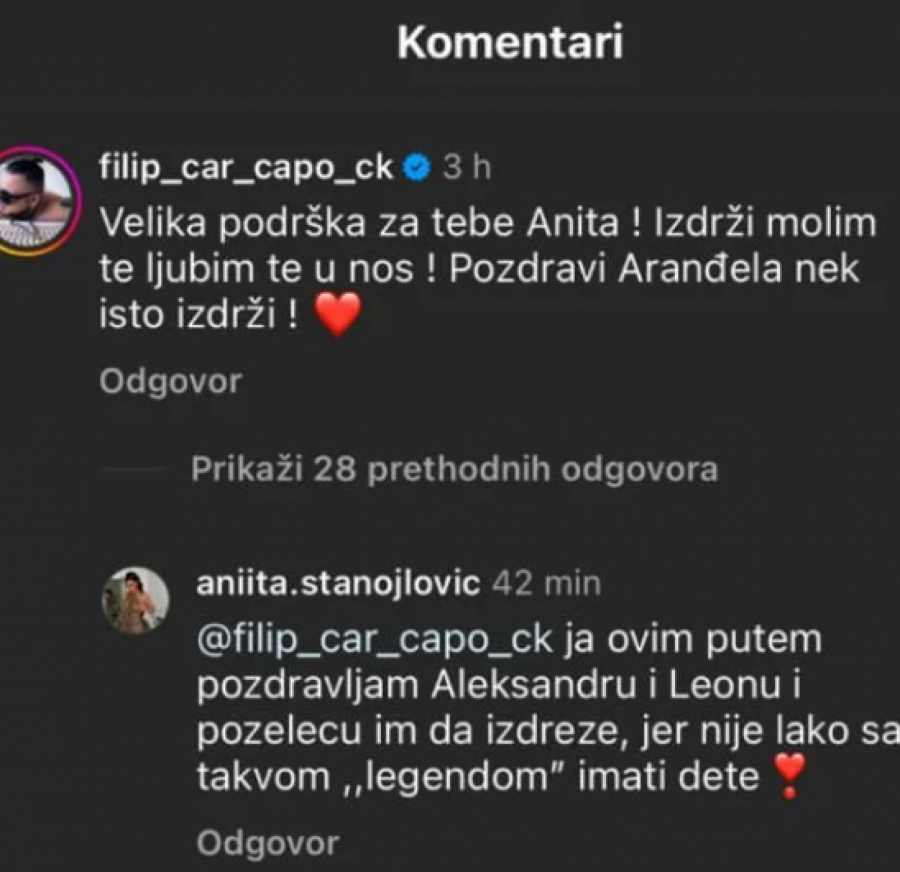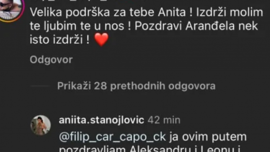 - Velika podrška za tebe Anita! Izdrži molim te, ljubim te u nos. Pozdravi Aranđela neka isto izdrži - glasila je poruka Filip Cara uz emotikon crvenog srca.