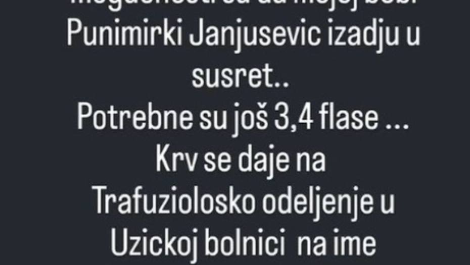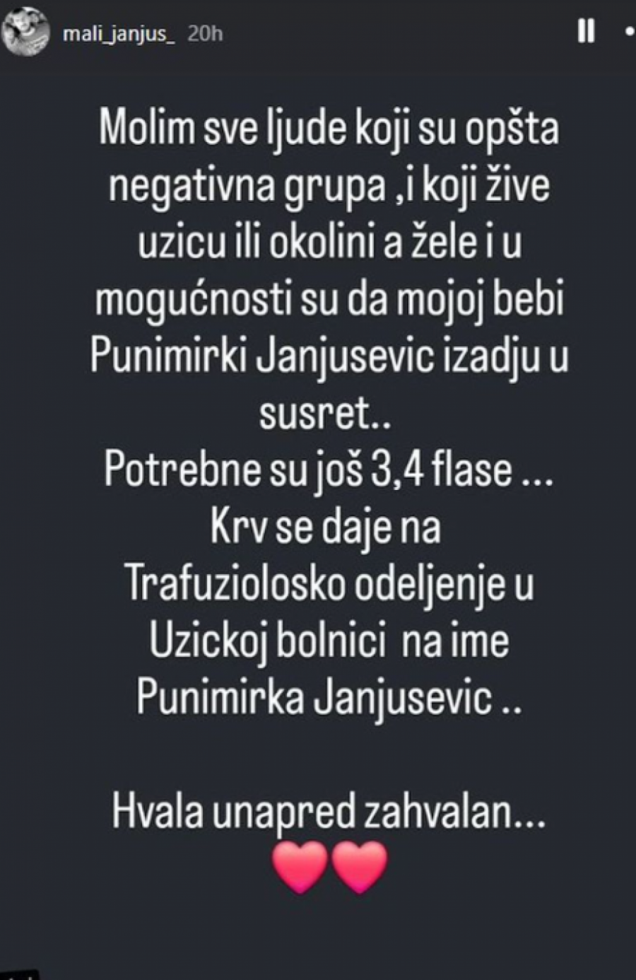 - Potrebne su još tri, četiri jedinice... Krv se daje na Transfuziološkom odeljenju u Užicu na ime Punimirka Janjušević. Hvala, unapred zahvalan - napisao je Marko na svom Instagram storiju.
