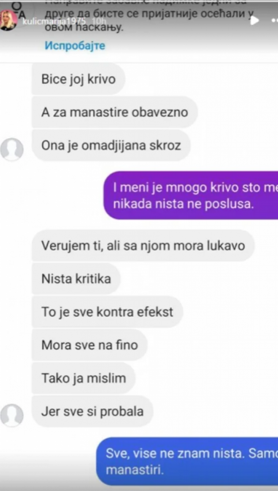 Pored toga, Marija je odlučila da kazni Miljanu tako što joj za Novu godinu neće poslati čestitku, a na svom Instagram profilu je objavila prepisku sa nepoznatom osobom.
