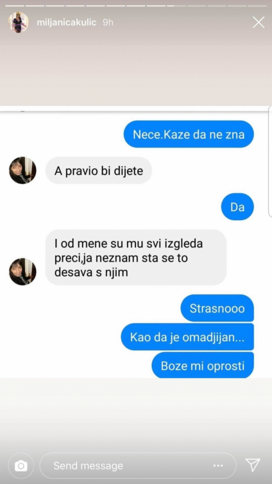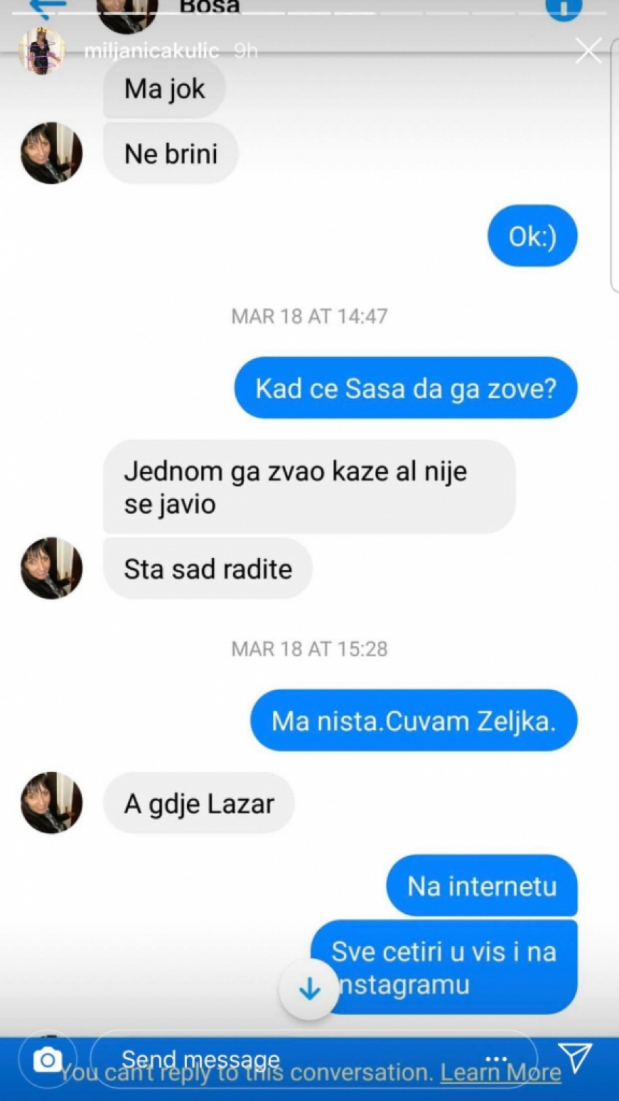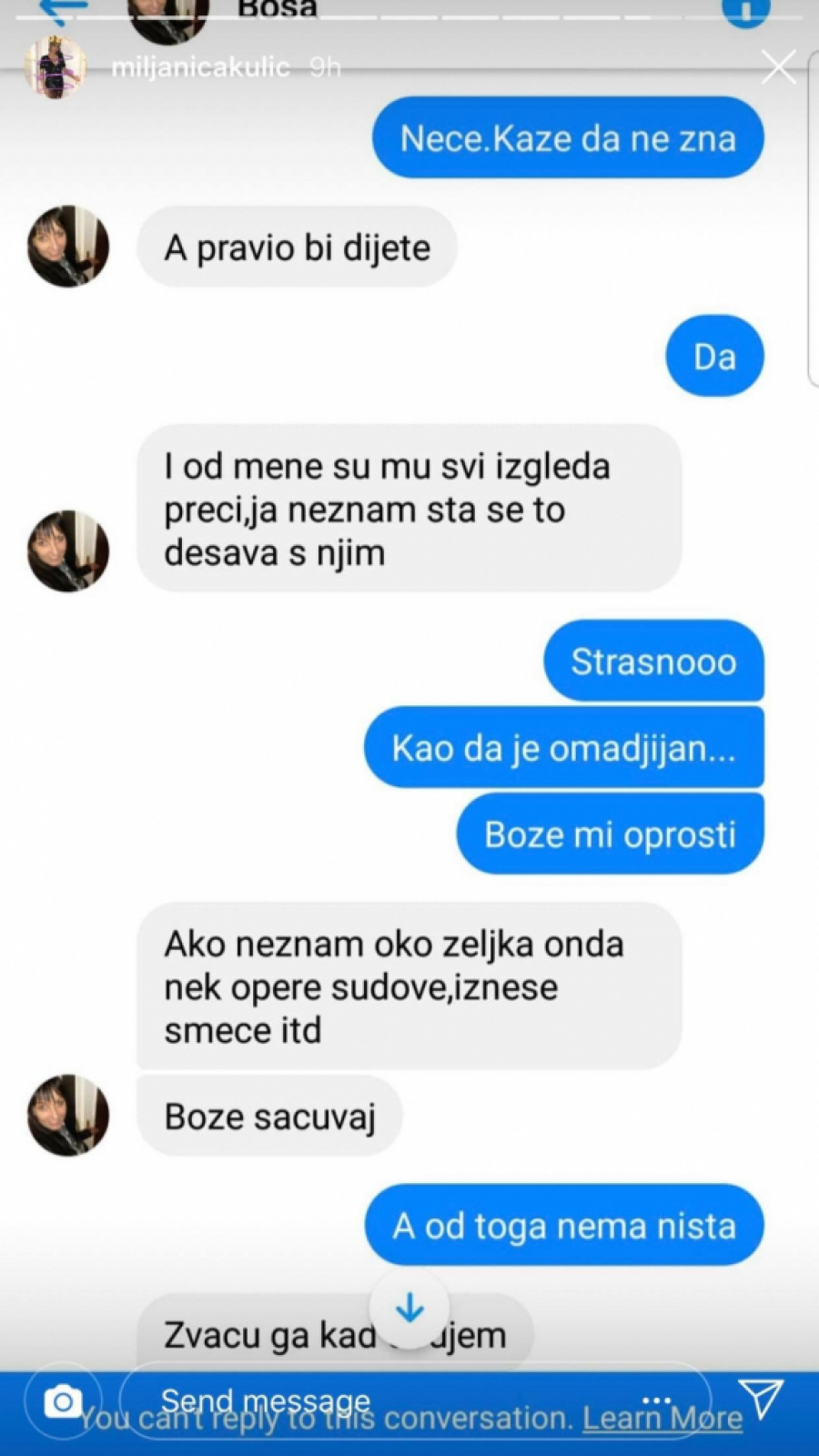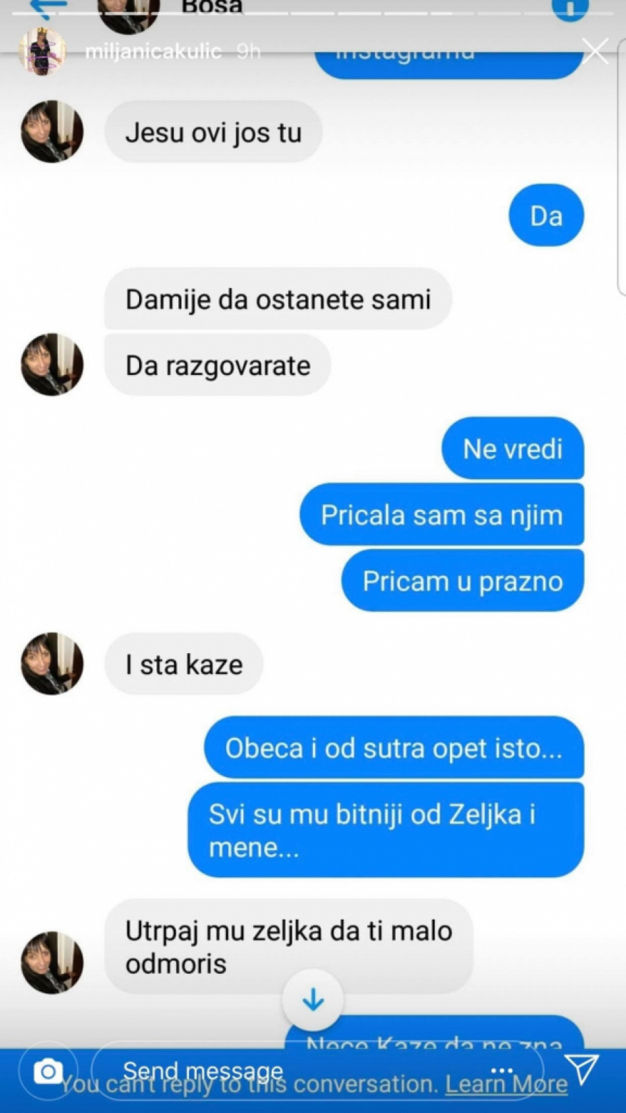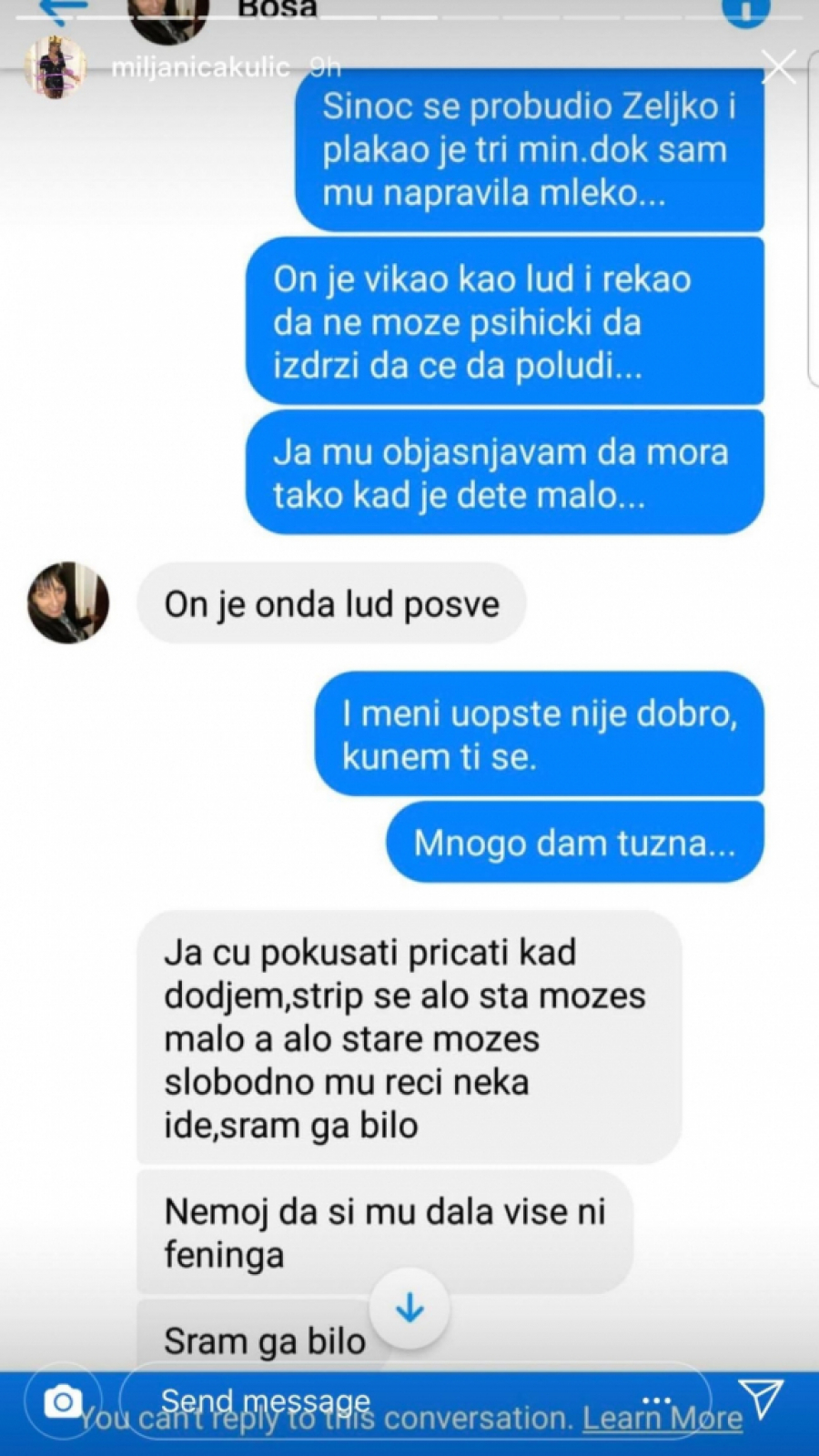 "Sinoć se probudio Željko i plakao je tri minuta dok sam mu napravila mleko... On je vikao kao lud i rekao da ne može psihički da izdrži, da će poludeti. Ja mu objašnjavam da mora tako kada je dete malo. I meni uopšte nije dobro, kunem ti se. Mnogo sam tužna", napisala je Miljana, a onda je mama Bosa ponovo pokušala da popravi situaciju.