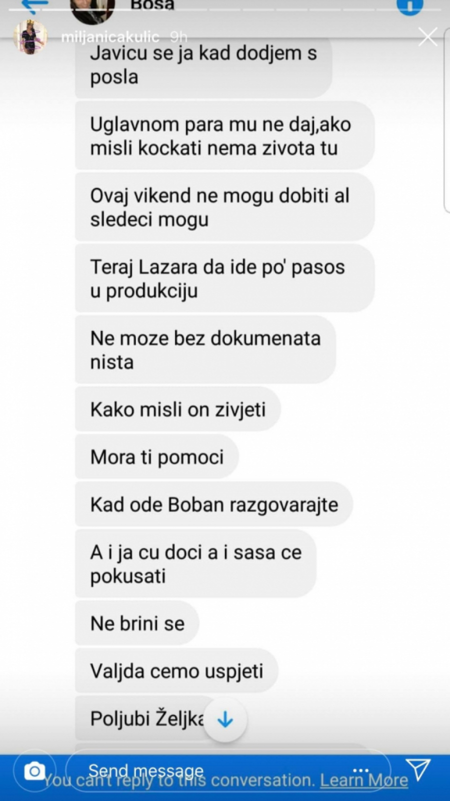 "Ja sam na poslu, celu noć nisam spavala. Ja ne mogu da verujem da je Lazar toliko nedokazan. Pričala sam i sa Sašom, nazvaće ga on samo da proba da mu obbjasni neke stvari. On mora da se uozbilji ako želi dobro i sebi i svima nama oko sebe. Javiću se ja kad dođem sa posla, uglavnom para mu ne daj, ako misli da se kocka. Ovaj vikend ne mogu dobiti ali sledeći mogu. Teraj Lazara da ide po pasoš u produkciju, ne može bez dokumenata ništa. Kako misli on živeti? Mora ti pomoći. Kad ode Boban razgovarajte, a i ja ću doći, a i Saša će pokušati. Ne brini se, valjda ćemo uspeti. Poljubi Željka", deo je razgovora između Miljane i Lazarove mame.
