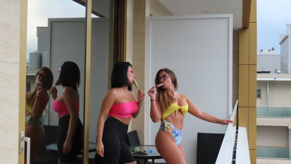 Našu pažnju privukle su atraktivnim izgledom, ali i gromoglasnim smehom dok su u najperverznijim pozama lizale sladoled. Kao da su znale da je naš paparaco blizu, pa su poželele da svojim izgledom i izrazom lica raspaljuju mušku maštu. Kako li bi se tek ponašale da su nas zaista uočile? Možda bi im i minijaturni kupaći kostimi „slučajno“ spali, pa bi nam pokazale čime raspolažu…