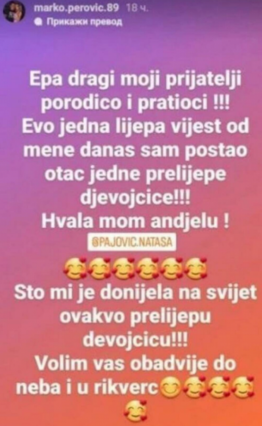 - E pa, dragi moji prijatelji, porodico, i pratioci. Evo jedna divna vest od mene. Danas sam postao otac jedne prelepe devojčice. Hvala mom anđelu što mi je donela na svet ovako prelepu devojčicu! Volim vas obe do neba i u rikverc - napisao je Perović.