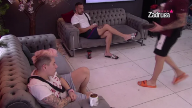 Zadrugari su tek ustali i skuvali svoje prve jutarnje kafe uz koje su započeli svoje jutarnje priče. Jovana Tomić Matora i Dino Dizdarević su seli na sivu garinituru u dnevnom boravku gde su prepričavali događaje od sinoć, te se bacili na pozdrave!