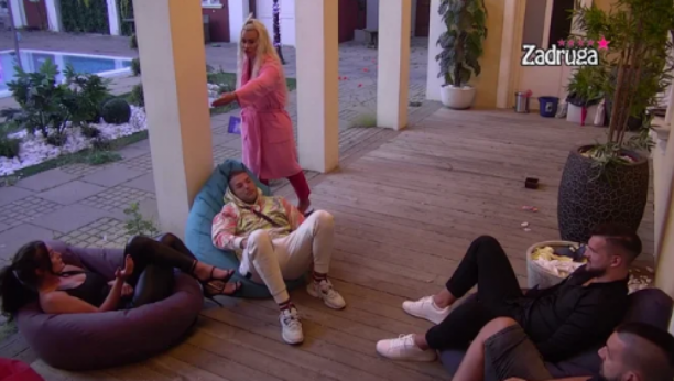 Zadrugari su već neko vreme ispod trema, gde provode vreme opuštajući se nakon lude žurke.