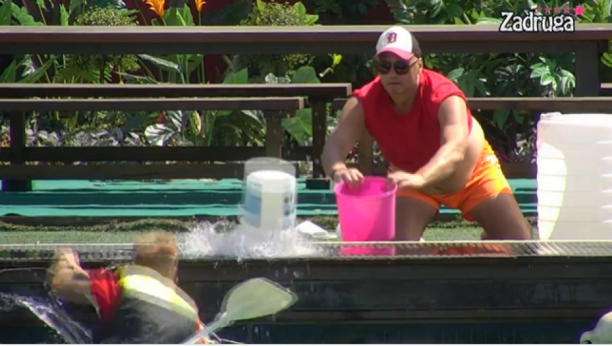 Jovana Tomić Matora je doživela peh kada je htela da dosatvi kofu koja je bila puna vode. Tom prilikom je pala u jezero, a zadrugari su popadal od smeha.