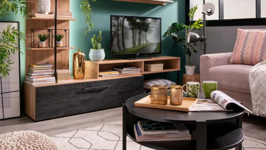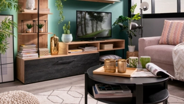 Najbolje je da dominantan dekor primenite na velikim površinama, poput regala, ormara, prozora ili poda. Regal EVORA, u kombinaciji dekora artisan hrasta i carbon dekora, sjajan je primer i predstavlja moderno i funkcionalno rešenje. Klub sto TOBAGO (CFTT5024) u crnom drvo dekoru je uz njega odličan dodatak i na neočekivan način dovodi do sklada u ambijentu i dodatno ističe teksturu regala.
