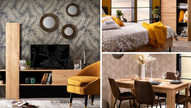 Čak i ako u vašem enterijeru već preovlađuju tople zemljane nijanse kojima ćete lako dodati jesenju dekoraciju, moguće je uvesti floralne šare kroz dekorativne komade, poput jastučnice. Braon tonovi idealna su podloga za uvođenje manjih floralnih dezena, koji će u pravim nijansama samo osvežiti jesenji ambijent. U trpezarijskom prostoru u braon tonovima, trpezarijski sto OSCAR u artisan hrastu sjajan je izbor za centralni deo, a dizajneri enterijera Forma Idale predlažu da ga kombinujete uz trpezarijske stolice HTC 316, koje sa ugaonom garniturom GRANADA čine prostor elegantnijim.