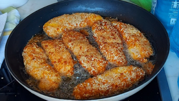 Uvaljati u brašno, jaja, prezle, jaja i susam izmešan sa sojinim pahuljicama...Pržiti u dubokom ulju poklopljeno da porumeni.