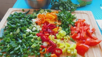 Iseckati crni lik pa ga propržiti , dodati sečenu papriku. vezu srembuša. isečenog paradajz i pržiti da ispari tečnost.
