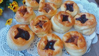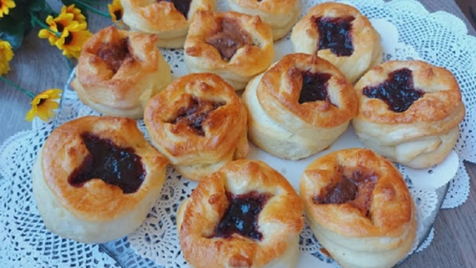 Spajati po dve i makazama iseći sredinu kao u Videu i u sredinu staviti kažičicu džema ili eurokrema Malo neka odmore pa ih premazati žumancetom i peći na 190 stepeni C oko 30-35 min.