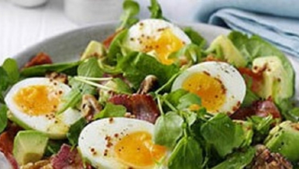 Propržite 100g pančete. Skuvajte dva jaja, ošljuštite i iseckajte na kriške. Slaninu i jaja pomešajte sa zelenom salatom. Količinu zelene salate odredite prema sopstvenoj želji.