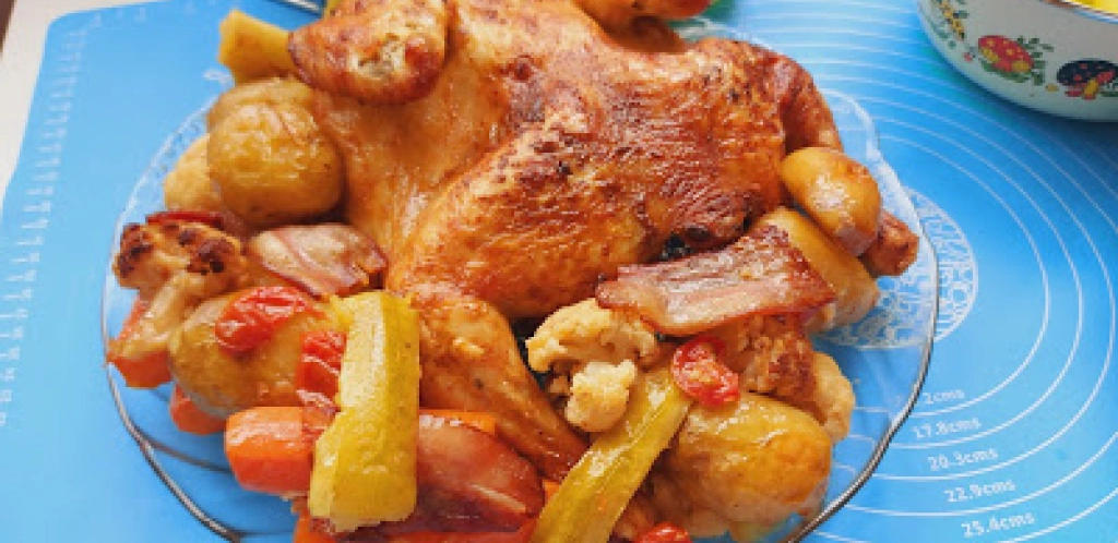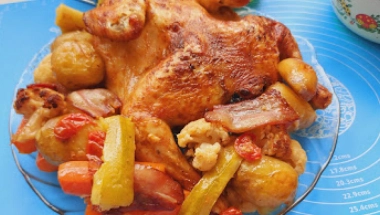 Time premazati pile a na kraju sa dve kašike kajmaka premazati. Ostatak marinade sipati u povrće koje isečete na krupnije komade. Okrugli pleh podmažete malo četikicim i uljem pa rasporedite povrće. Preko stavite rešetkastu žicu i odozgo spremljeno pile. Peći ma 200 stepeni C oko sat vremena ako treba i duži da se pile lepo ispeče a povrće zarumeni. Savršenstvo...