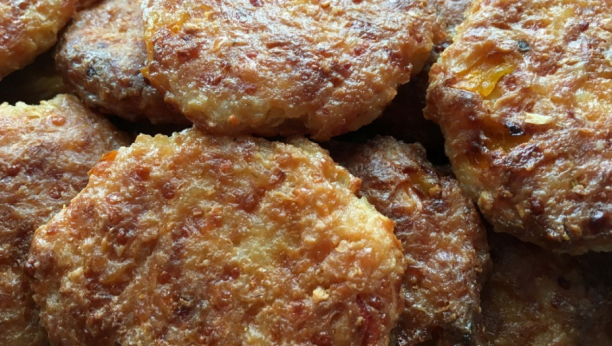 U međuvremenu, u tanjiru viljuškom razmutiti dva jajeta. Od pripremljene mase praviti šnicle, svaku uvaljati u brašno, zatim u jaja i pržiti na zagrejanom ulju sa obe strane.