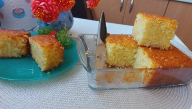 Pustiti da vri 5 min pa ohladiti. Pečen vruć kolač iseći na kocke i preliti . Ostaviti da upije i sladiti se.