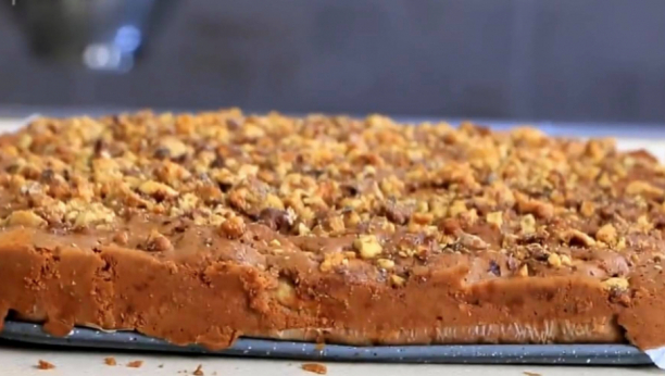 mešajte i sipajte u pleh 20x25, pleh podmažite ili dno obložite pek papirom. Odozgo možete ali i ne morate staviti malo oraha ili lešnika. Peče se na 180 stepeni oko 40 minuta.
