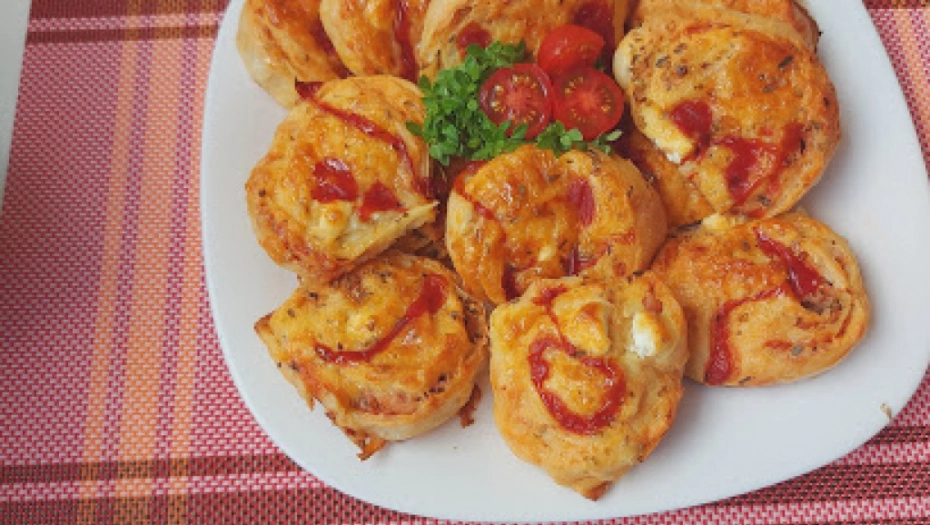 Na zadnju premazanu koru u donjem delu po širini poredjati šunku rendanu a i malo listova. šunke. Odozgo staviti malo kečapa i origana. Saviti malo krajeve pa uviti rolat koje isecite na rolatice oštrim nožem .Redjati u podmazan pleh. Odozgo dodati ostatak sira i narendanog kačkavalja,