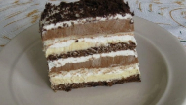 Braon kora: Umutiti 4 jaja sa 4 kašike šećera dok se šećer ne istopi. Dodati kašiku kakaoa i kašiku brašna, promešati varjačom i na kraju dodati 3 kašike rendane čokolade. Smesu izliti u pleh obložen papirom za pečenje i peći koru na 180 stepeni oko 15 minuta. Od preostalog materijala napraviti još jednu koru.