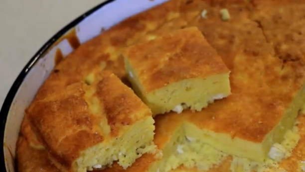 Umutite kratko žumanca, dodajte mleko, jogurt, vodu, so. Promešajte pa mikserom umešajte brašno. Sir izmrvite u testo. Od belanaca umutite čvrst sneg i lagano umešajte u testo, ne zaboravite i pola kesice praška za pecivo. Sipajte u tepsiju u kojoj se rastopio maslac, ne treba ga hladiti.