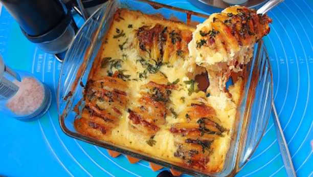 Izvaditi krompir iz rerne i preliti sa pavlakom. i odozgo po krompiru razbacati još malo rendanog kačkavalja. Foto: Bakina Kuhinja