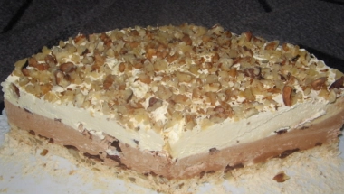 150 g keksa, 250 g margarina, 250 g čokolade, 150 g šećera u prahu, 7 jaja, 2 šlaga, 100 g oraha ili lešnika.