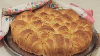 Preostlaim puterom premažemo pleh 30 cm prečnika pa slažemo kifle. Okolo idu najveće ( odokativno procenite ), u sredinu idu preostale tako što prvo pravite krst pa najmanje kifle stavljate kao krake pahulje, izmedju stranica krsta.