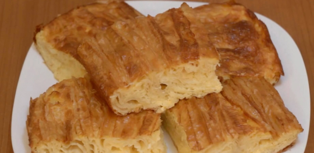 Priprema: Ulupati 4 jaja sa solju, pa naliti jogurt, ulje i vodu i opet dobro promešati. Na kraju dodati prašak za pecivo pa sjediniti. Uključiti rernu na 200 stepeni. Na dno tepsije staviti dve kore, višak ubaciti unutra. Sve ostale kore saviti u lepezu, na širinu sa dva prsta. Preko dve kore u tepsiji poslagati lepeze jednu do druge. Preliti sve umućenom smesom od koje ćete ostaviti nekoliko kašika da ih umutite sa preostalim jajetom. Smesu sipati u žljebove izmedju, pa četkicom za premazivanje ili kašikom rasporediti ravnomerno svuda. Umutiti preostalu smesu sa jajetom pa preliti odgore i razmazati svuda. Staviti da se peče dok ne porumeni. Poslužiti toplu. Prijatno.