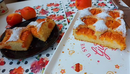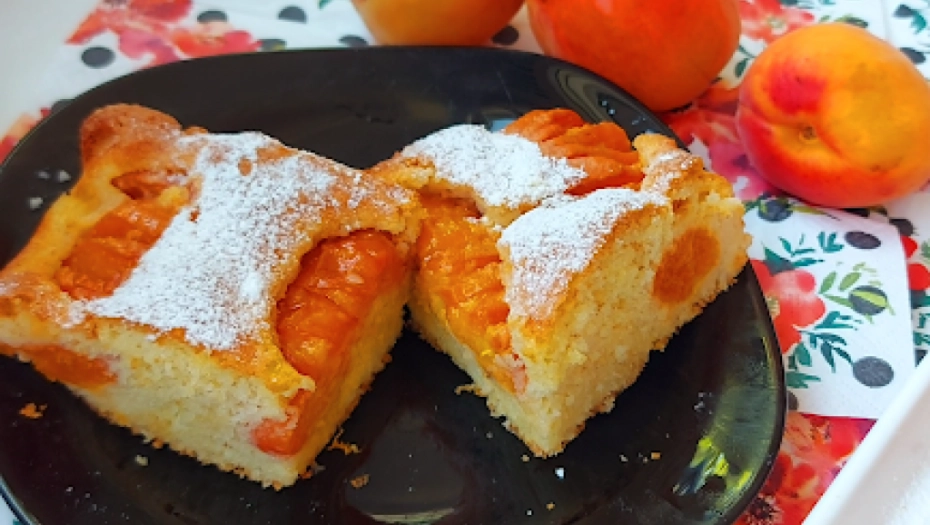 Sipati u manji podmazan pleh 25 x 15 cm. Kajsije dobro oprati i podeliti na pola pa svaku polovinu zasreći. Uroniti u testo.