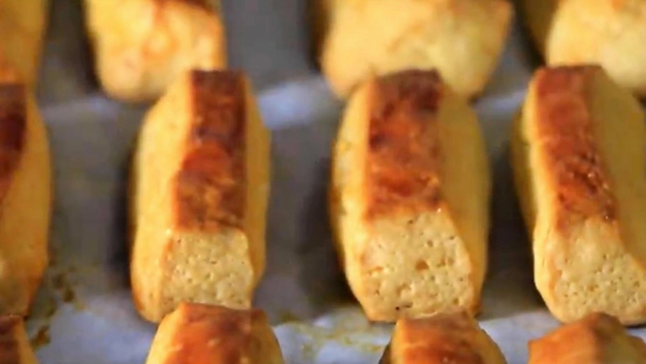 Ostavite da stoji oko 20 minuta u frižideru ili 10 minuta u zamrzivaču. Razvucite oklagijom, debljinu 1 cm ili koliko želite, premažite umućenim jajetom pa isecite štangle.