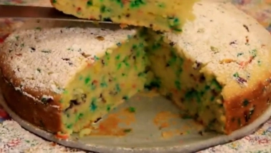 Umutite jaja i šrćer, umešajte sve ostale sastojke osim šarenih mrvica. Njih umešajte na kraju. Pecite u zagrejanoj rerni na 200 stepeni oko 40 minuta. Kalup je prečnika 20 cm, moze i 23 cm. Ili manja četvrtasta tepsija, kalupi za mafine, kuglof...