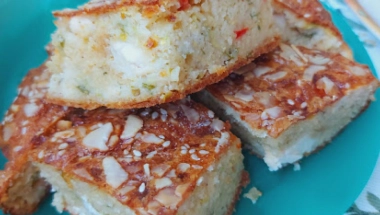 Sve izjednačiti i istresti u podmazan pleh od 22 cm ili koji želite. Poravnati i peći na 200 stepeni C 50 min da lepo zarumeni i tečnost ispari.. Prohladjenu seći. Odlična kao predjelo, užina ili večera..
