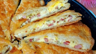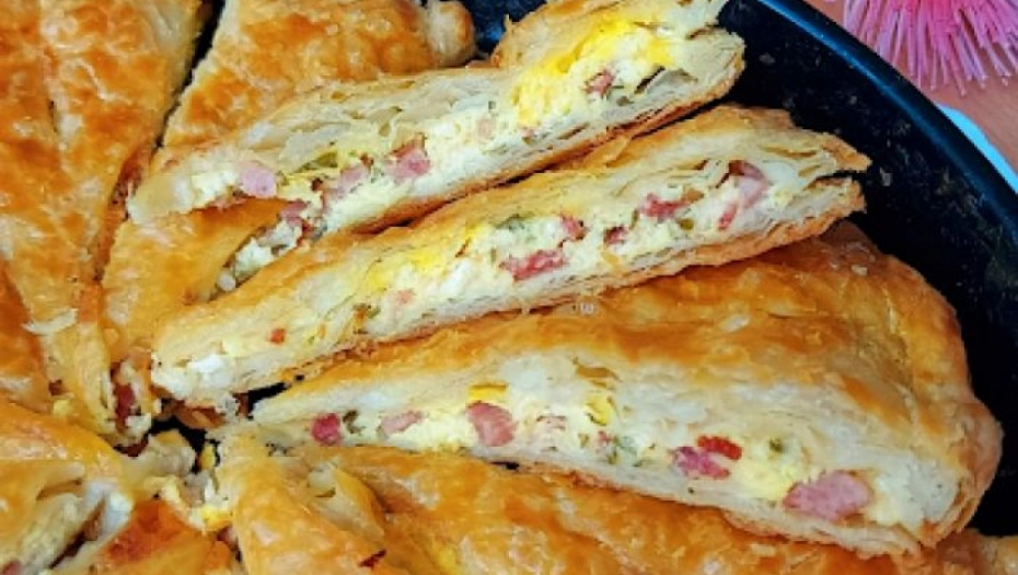 Prilikom svakog prebacivanja premazati maslacom. Razviti za pola cm i staviti u pleh podmazan maslacom. U sir staviti jaje i seckanu šunku i izjednačiti.