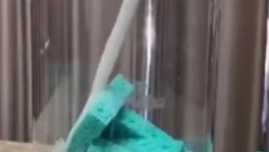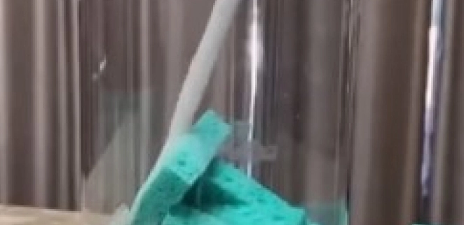 Nakon toga u posudu do vrha sipa vode, dodaje ostatak sunđera i sve dobro promeša. U videu naglašava da je važno pomešati vodu i omekšivač u odnosu jedan prema jedan.