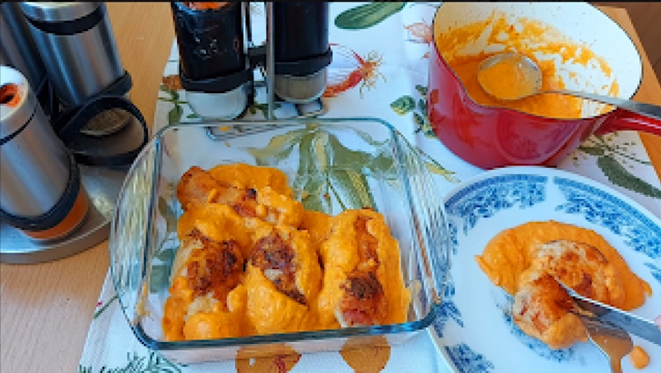 Štapom za blendanje izblendirati. Šnicle izvaditi u tacnu i preliti sosom. Možete posuti peršunovim listom. Uživajte u fantastičnim ukusu.