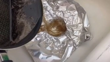 Njega stavi preko odvoda i nagura ga u otvor kako bi dobila oblik čaše. Nakon toga u nju izlije preostalu masnoću iz tiganja i nakon nekoliko minuta je baci u smeće.