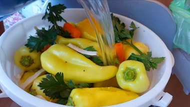 Staviti platični obruč i kamen ili pak sipati u kese vodu i dobro je zatvoriti zaaparatom i pritisnuti. Posle 7 dana je pogledati pa je doliti jer će paprika upiti tečnost. Može stajati do sledeće turšije.