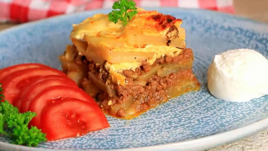 Isecite krompir na tanke kolutove, malo posolite i dodajte kašiku brašna. Posudu u kojoj ćete peći namažite uljem i ređajte krompir u krug. Stavite jedan deo mesa, potom krompir, meso, krompir.