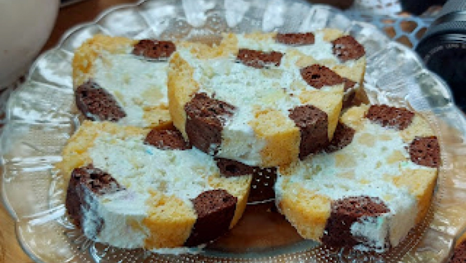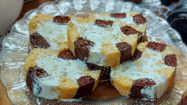 Umutiti jaja sa šećerom dodati brašno i prašak za pecivo i ulje. Podeljiti na dva dela u jedno dodati kakao i kašiku ulja i dobro izjednačiti.