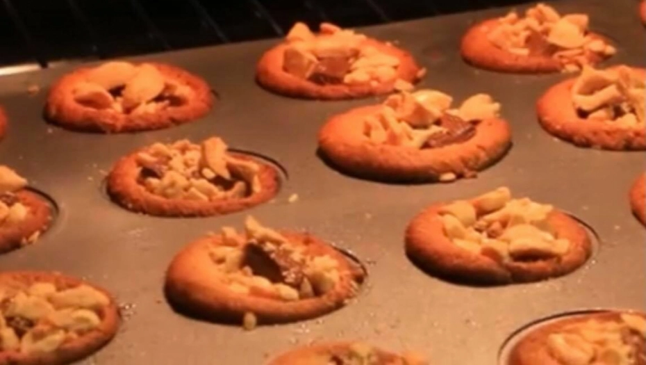 Kalup za male mafine namažite uljem ili puterom i u svaku rupicu stavljajte testo. Utisnite čepom za flaše i u svaku rupicu stavite komadić čokolade, kikiriki i pecite na 170 stepeni oko 25 minuta.