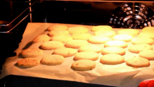 Na pek papir tanko razvući testo i modlom ili čašicom vaditi kolutiće. Peći u zagrejanoj rerni na 220 stepeni.