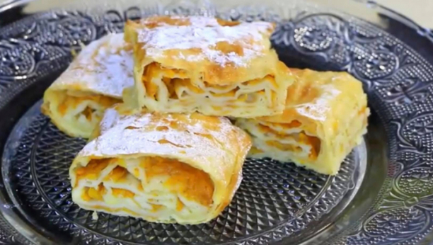 Raširite jednu koru, premažite tri kašike premaza, stavite drugu koru, opet premaz pa treću koru. Na nju poređajte rendanu bundevu, urolajte lagano i slažite na podmazanu tepsiju. Tako radite sve do kraja.