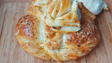 Dobili smo dve tanje rolnice koje presečemo na pola i upletremo kao kike koje obavijemo loptica u plehu. Na isti način premazati 4 razvije loptice stim što razvijeno testo sečemo unakrst a svaki trougao po malo po sredini a uglove provučemo kroz otvore i trouglove redjamo izmedju lopti u plehu. Foto: Bakina kuhinja