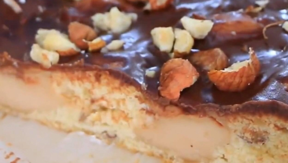 Prokuvajte slatku pavlaku, margarin, čokoladu i premažite preko kolača (vruća čokolada preko mlakog kolača). Pospite lešnicima i ostavite da se stegne pa isecite kocke ili šnite po želji. Prijatno.