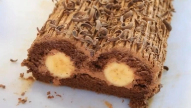 Banane ogulite i izrežite vrhove, pa dve stavite na jedan kraj fila tj. piškote a druge dve na drugi kraj. Umotajte strane prema sredini. Dobro pritisnite da se rolat zalepi, premažite ostatkom fila i stavite u frižider da se stegne. Zatim išarajte viljuškom, pospite rendanom čokoladom ili po želji. Secite šnite i uživajte u odličnom ukusu. Prijatno!