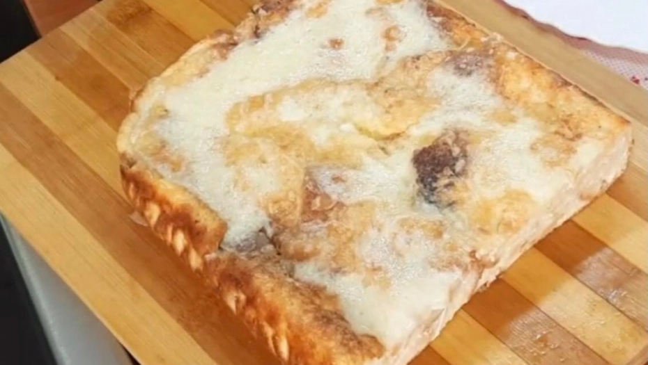 Hleb iseći na sitne komadiće, zatim umutiti jaja, sir, vodu i prašak za pecivo pa preliti preko hleba.