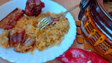 Kupus iseći na rezance, dodati mast, suva rebra, tucanu paprku, malo biber, lovorov list i sipati malo vode i dinstati pola sata.
